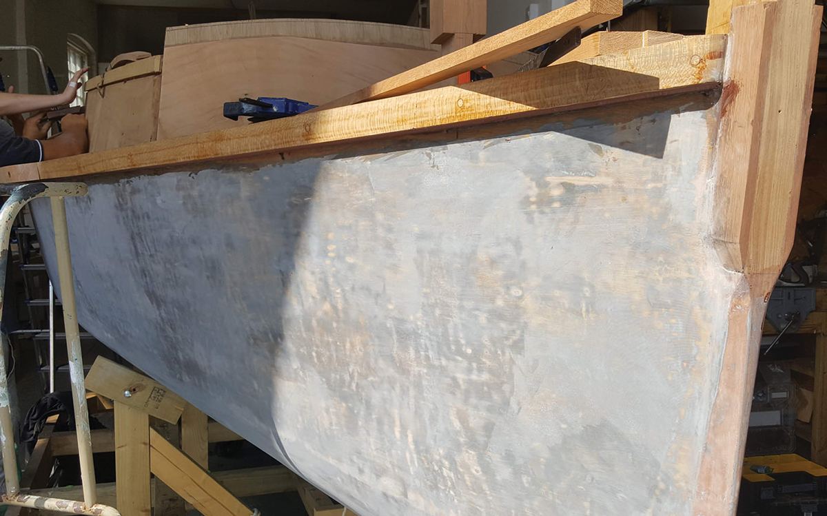 The laminated channels were roughly curved to the hull shape before delivery but needed extra planing and some time spent dry-fitted to take the shape of Harvey’s actual hull shape