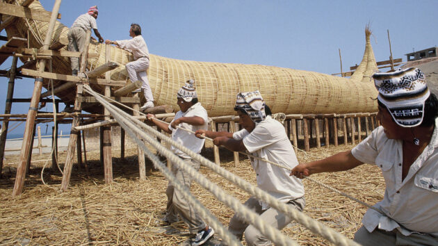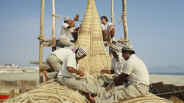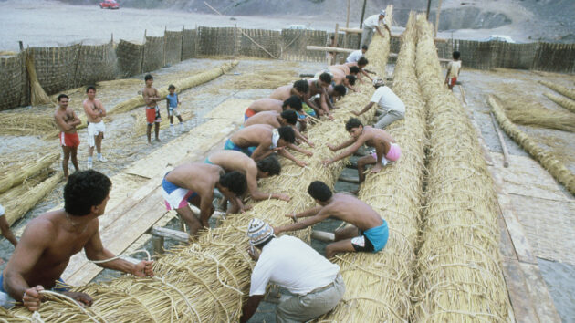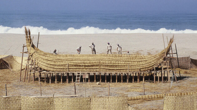 With the help of eight Aymara craftsmen, he set up a temporary shipyard South of Lima, with construction planned through the summer months.