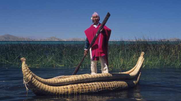 Paulino Esteban standing on a totora reed boat in traditional dress, Lake Titicaca, Bolivia. Photo: James Brunkner / Alamy.