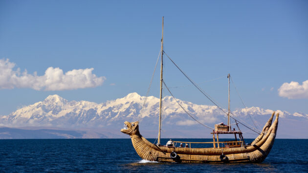 Typical reed balsa boat on Lake Titicaca. Credit: Harald von Radebrecht / Alamy.
