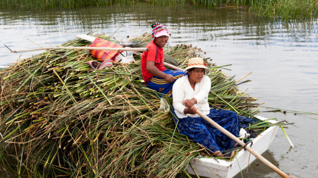 As the lake level drops and its waters grow increasingly polluted, diminishing totora reed populations further threaten the Uros way of life. Gathering sufficient reeds to meet their construction needs is an increasing problem. Photo: Westend61 GmbH / Alamy.