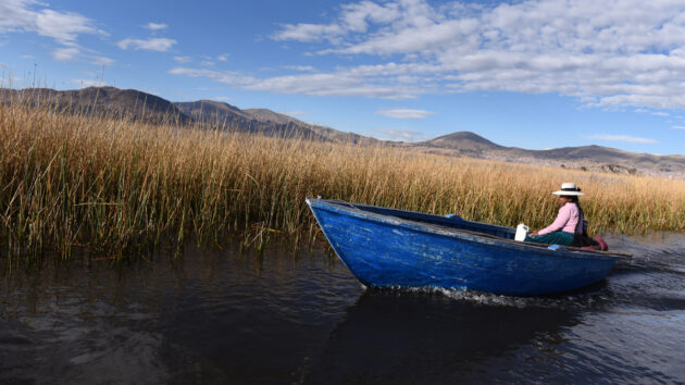 Harvested totora reeds being transported on a rowing boat on Lake Titicaca. Formal news outlets reported worrying contamination of the lake, its fish, and the all-important totora reeds already in 2016. Credit: Vibrant Pictures / Alamy.