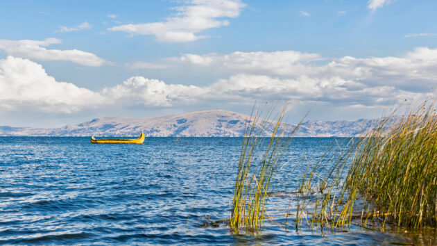 Lake Titicaca is in the Andes Mountains, bordering both Peru and Bolivia. At just over 3,800m above sea level, it’s the world’s highest navigable body of water. Credit: Rolf Schulten / Alamy.