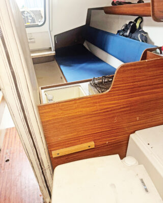 The two main berths go under the cockpit sole – long enough for the dog to sleep at my feet, and most of the food to be beyond the Mate’s feet.