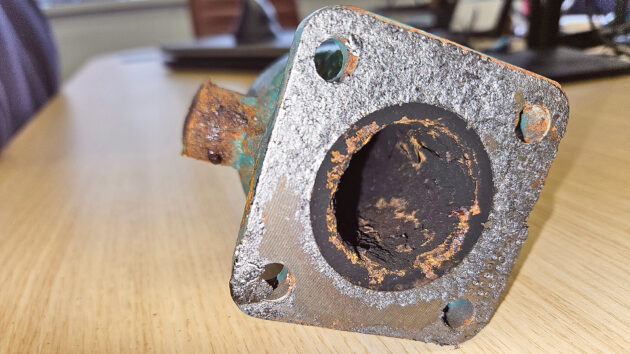 Removing and inspecting the exhaust elbow and heat exchanger will determine if maintenance is required. Photo: White Dot Sailing.