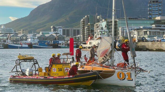 The NSRI helped after Trekka’s mainsail was ripped by a katabatic wind from Table Mountain. The incident was the Mini Globe Race’s first rescue. Credit: Don McIntyre / MGR2025.