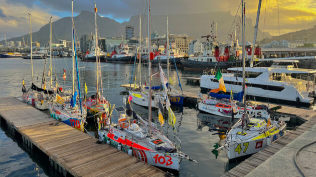 The Mini Globe Race’s fleet of Globe 580s arrives safely in Cape Town. Credit: JJ / MGR 2025.