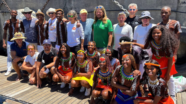 Adventurous ALMA GLOBE 580 solo sailors and 13 emotional African Zulu Dancers creating memories to last a lifetime! Credit: Don McIntyre / MGR2025.