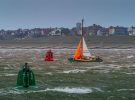 Keri Harris (Origami) narrowly avoided capsizing while up the mast recovering a halyard. He was sailing at 3kts under full main.