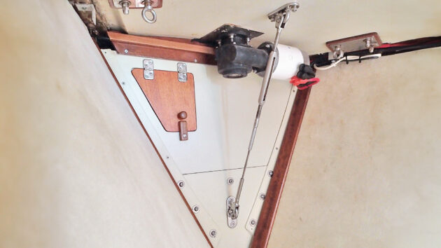 Forestay strut connecting underdeck pad-eye to anchor locker bulkhead. Photo by Nicholas Koligiannis.
