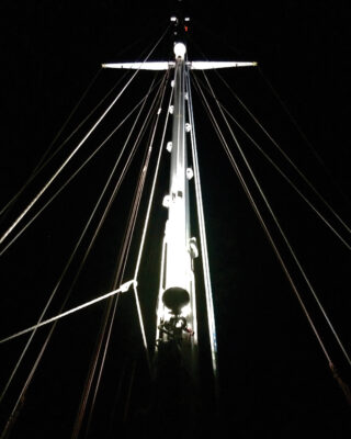 The lit mast as seen from Moments of Clarity’s foredeck. Photo: Nicholas Koligiannis.