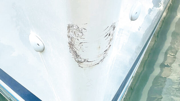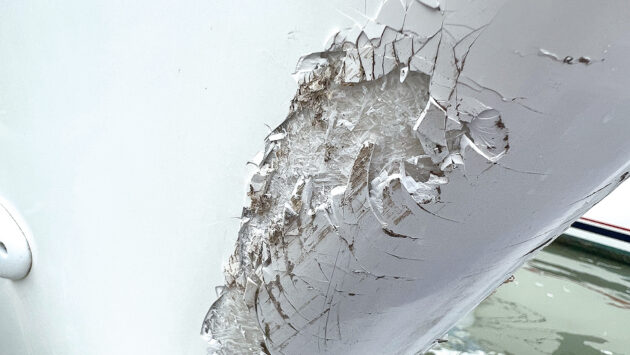 The glassfibre reinforced plastic (GRP) in that area had been compressed and the gel coat was split apart, so we had got off quite lightly and were impressed at the strength of our little Bavaria.