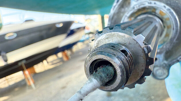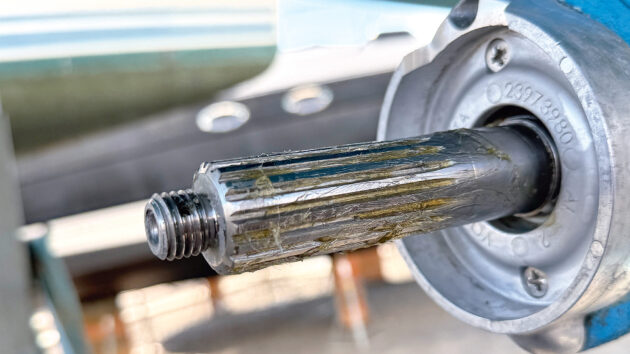 However, none of that grease must contaminate either the threads where the propeller cone tightens onto, or where the new locking bolt goes, which you will have just spent time getting clean. So carefully and slowly apply the water-resistant grease to these splines.