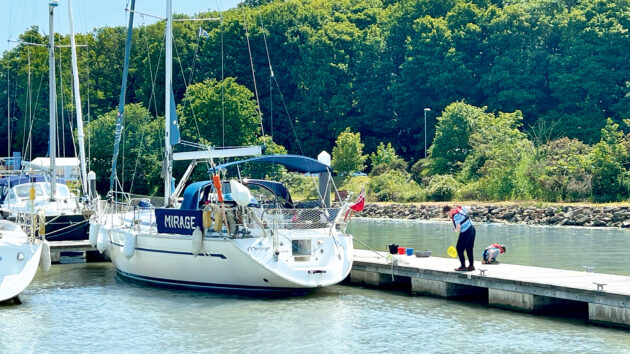 However, I was confident about manoeuvring Mirage in these conditions now. The idea is to keep a little speed on as you approach and then take it off with hard astern as you get into position, finally getting the midships line attached to the dock – simple and effective.
