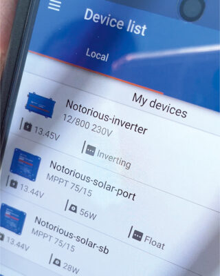 “I’ve tested it all except for the freezer. I’ve never used it. We’ll see how much it drains. I’ve got a Victron battery monitor to tell me the battery state, and a VirCru monitoring system,” he said; the latter being a way to remotely monitor things such as power, bilge levels, location and more from your phone.