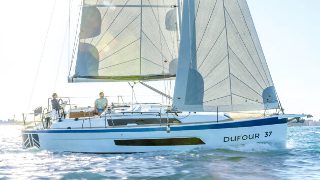 The Dufour 37, for example, has a race-boat style near-vertical stem and stern.