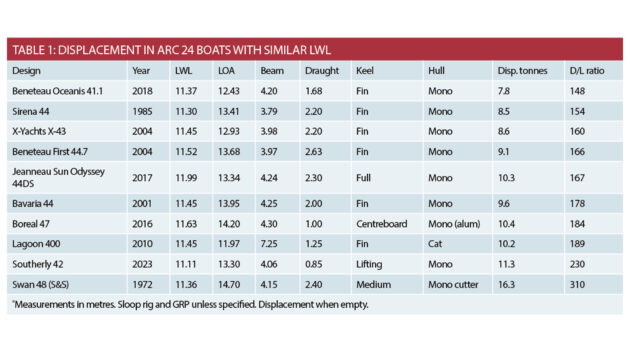 You can see that displacement varies hugely from the Beneteau Oceanis 41.1 at 7.8 tonnes to the Swan 48 (s&s) at 16.3 tonnes, showing that all sorts of yachts take on ocean sailing (though the comfort and speed with which they do this is considerably different).