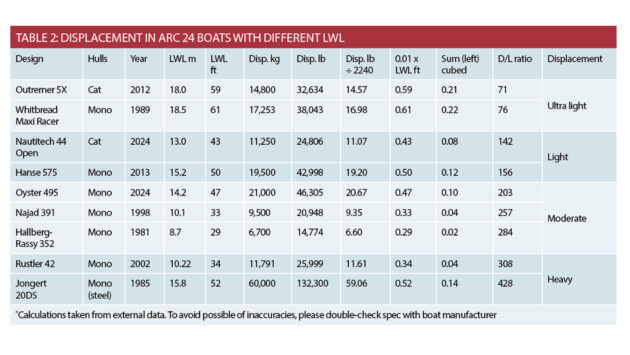 You can calculate the displacement-to-length ratio, but Ben Sutcliffe-Davies’s advice is to compare the weight of your boat to others of the same size and look at differences in speeds and other parameters, such as its righting capability.