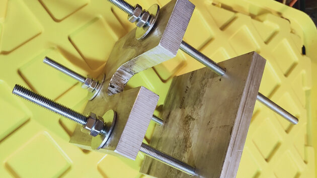 In my junk pile of various metal parts, I located two thick aluminium plates and a length of 10mm threaded bar. Some nuts and big washers completed the necessary parts.