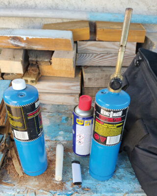 Gas for heating the shaft and prop, and a candle for applying molten wax. Photo: Zoran Glozinic.